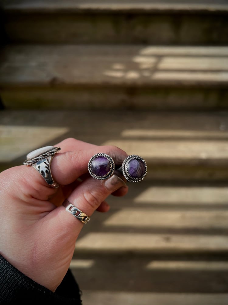Hand-fabricated in .925 sterling silver, these amethyst-adorned bolts add a bold touch of color to your build. Set in a serrated bezel with sterling rope detail, each bolt showcases natural amethyst, a stone long associated with strength and protection—perfect for the road ahead.