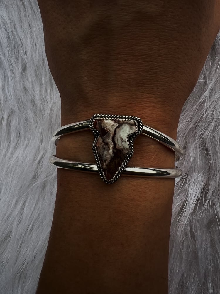 This stunning Wild-Horse Magnesite arrowhead cabochon has been set in a serrated bezel setting with sterling rope detail. This cuff features a comfortable double split band that really makes the stone pop.