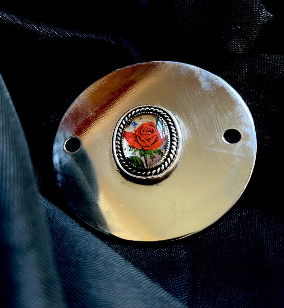 Points cover adorned with a rose cabochon in a .925 sterling setting.