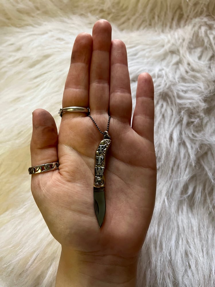 Fully functional mini brass pocket knife adorned with .925 sterling FTW. Comes on an 18” sterling bead chain.