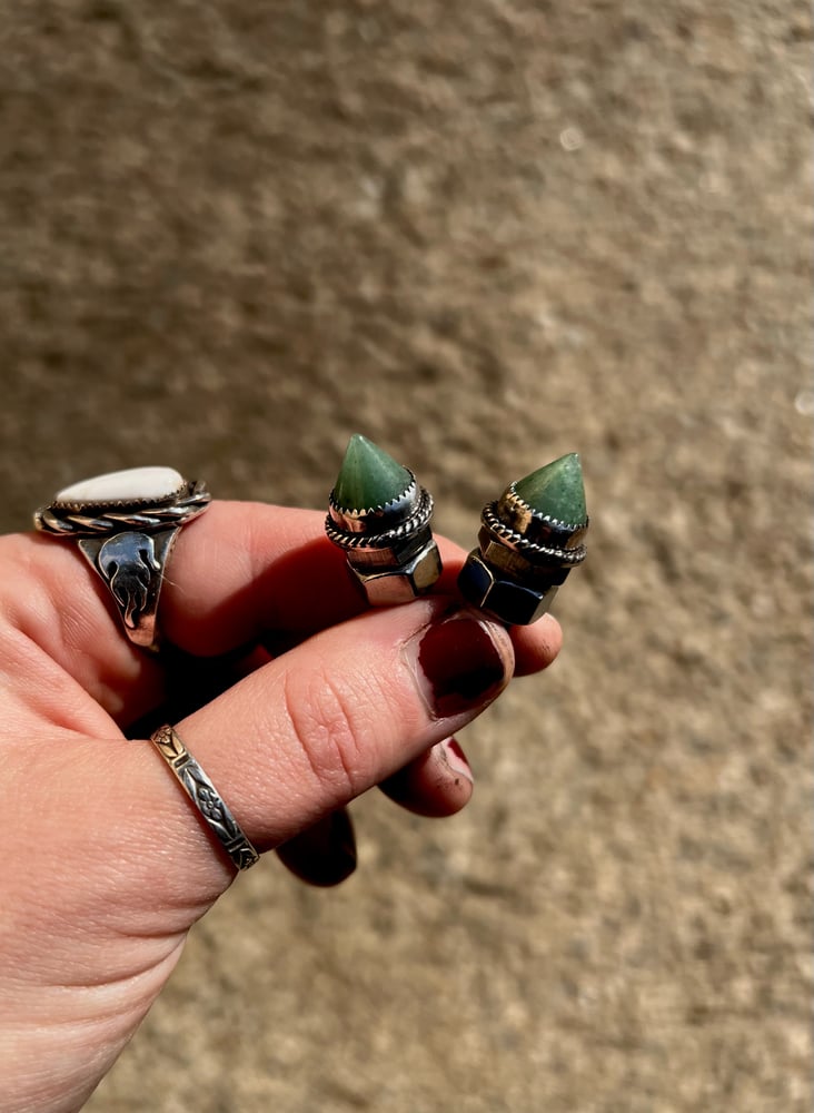 A fresh take on a classic spike—these Green Aventurine bolts bring a subtle, gemmy glow to your build. Hand-fabricated in .925 sterling silver, they feature a serrated bezel with sterling rope detail, adding just the right amount of flash.