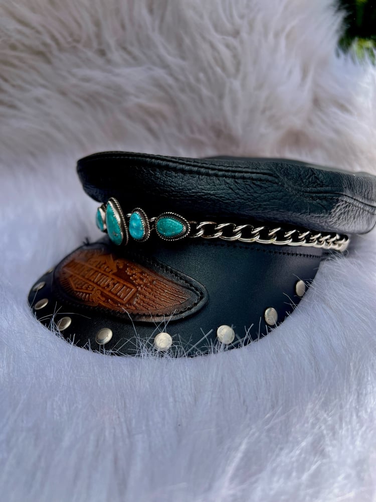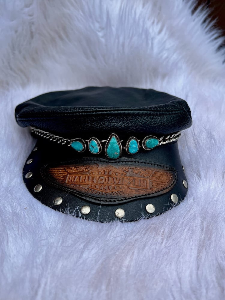 She's baaaaack! Your vintage hat dream come true, but better in The Highway Queen hats This riveted brim vintage leather Harley Davidson hat has been adorned with gorgeous, ultra vibrant White Water turquoise in hand-fabricated .925 sterling silver settings with sterling rope detail soldered to the original stainless chain.