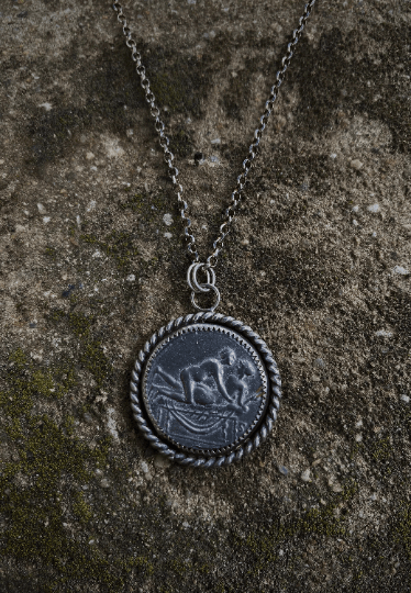 Each coin is unique featuring a different act and varying slightly in shape and size based on the cast from the original spintria. The back of the coins are numbered and the sterling silver setting has been cut to show the unique roman numeral on the back of the coin. The settings are hand-fabricated in .925 sterling silver and feature a serrated bezel and sterling cord.