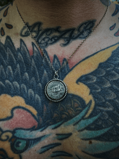 The pendant comes on your choice of a 20” diamond-cut rolo .925 sterling chain or a 16" diamond cut bead chain with a patina finish.