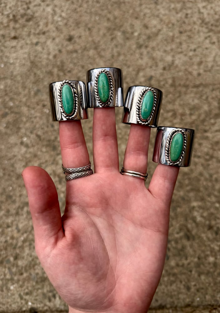 Kingman Turquoise Pushrod Collars. Built at my bench and finished with the OG Bad Companion setting: hand-fabricated sterling silver rope and serrated bezel detail that have held their place in silversmithing for generations.