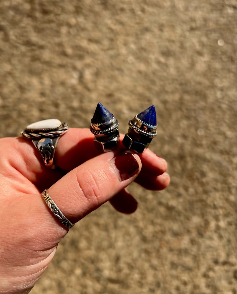 These bolts feature deep blue Lapis Lazuli, set in a hand-fabricated .925 sterling silver serrated bezel, accented with sterling rope detailing. The striking color of the Lapis Lazuli combined with the intricate silverwork creates a bold, eye-catching addition to your ride.