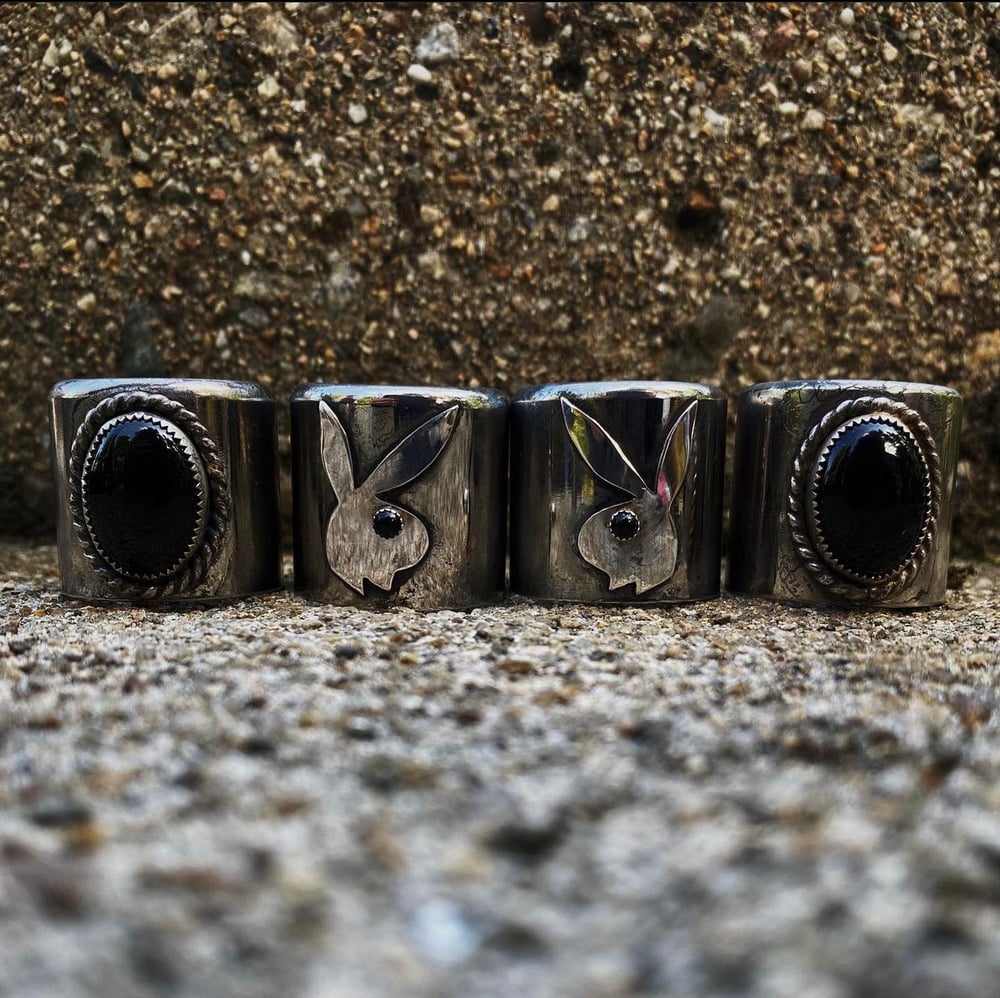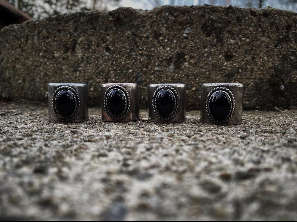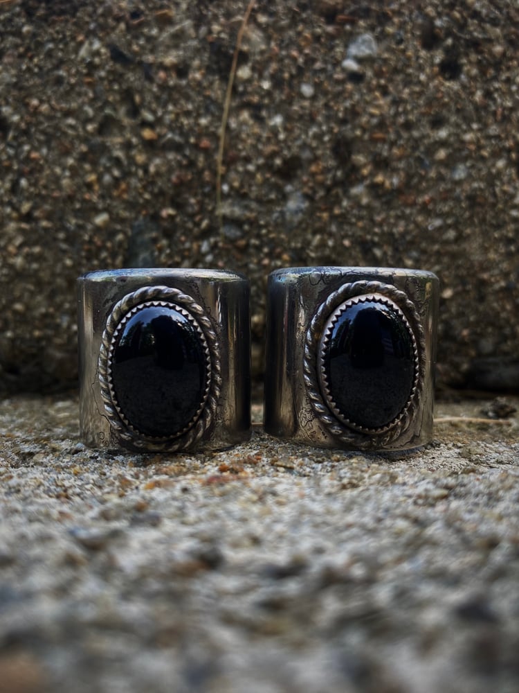 Pushrod collars with black onyx oval cabochons in a .925 sterling silver serrated setting with sterling rope detail. *PAIR OF 2 COLLARS*