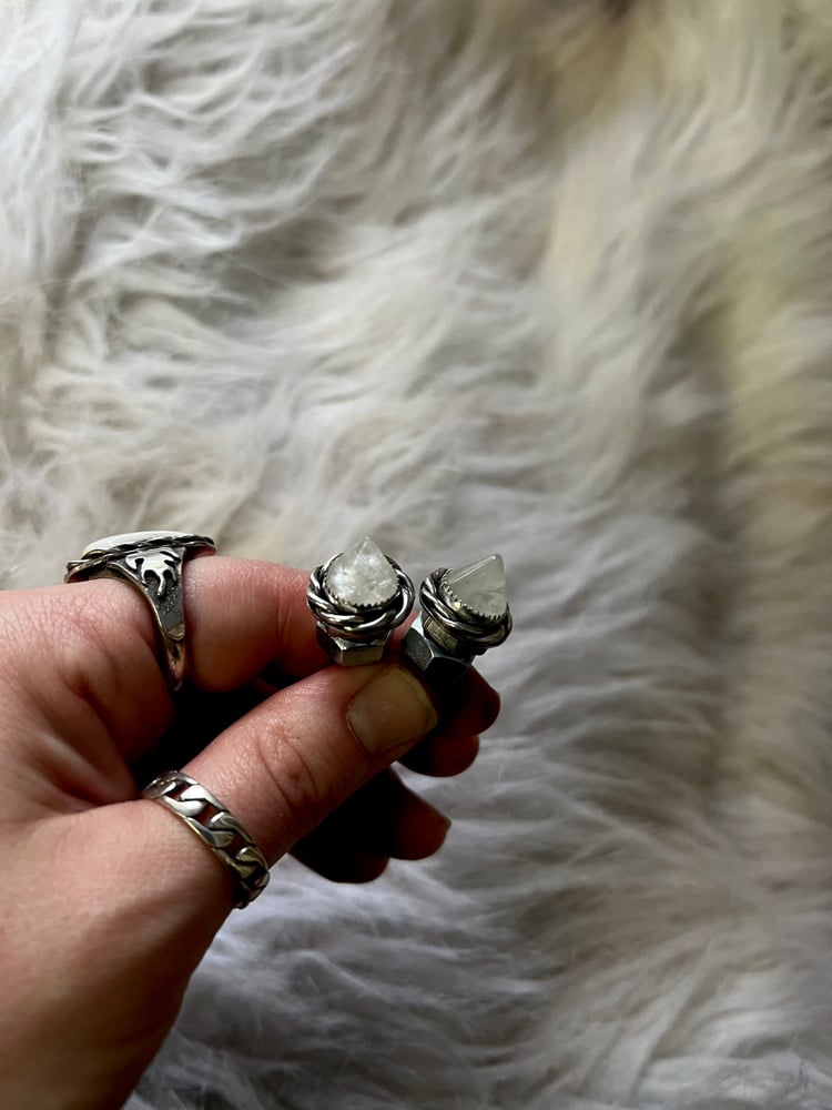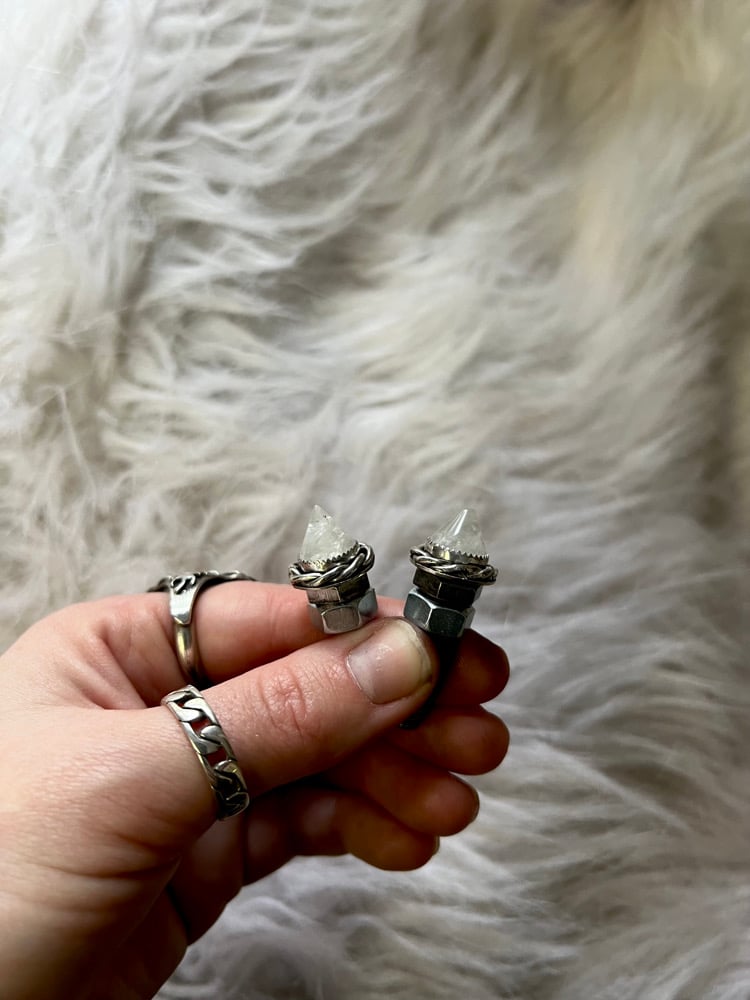 Handcrafted in .925 sterling silver, these Quartz Spike Bolts bring a raw edge to your build. Featuring natural quartz spike-cut cabochons, these translucent stones catch the light beautifully, adding an eye-catching flash to your setup. Set in a serrated bezel with hand-twisted sterling wire, every detail is built for those who like their hardware with a little extra shine.