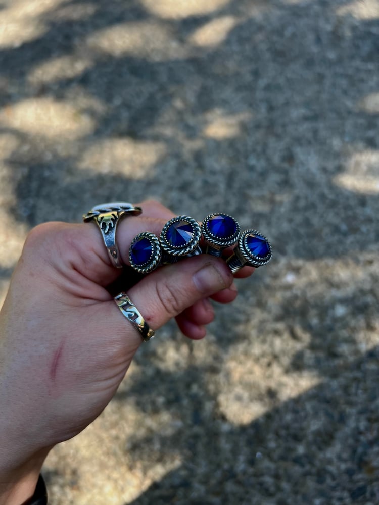 Hand-fabricated in .925 sterling silver, these bolts feature vibrant blue faceted cut lab-made spinel stones. Set in a serrated setting with your choice of thick or thin sterling rope border.