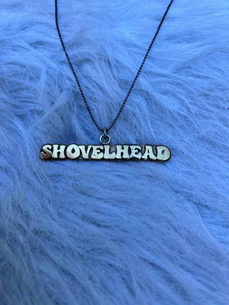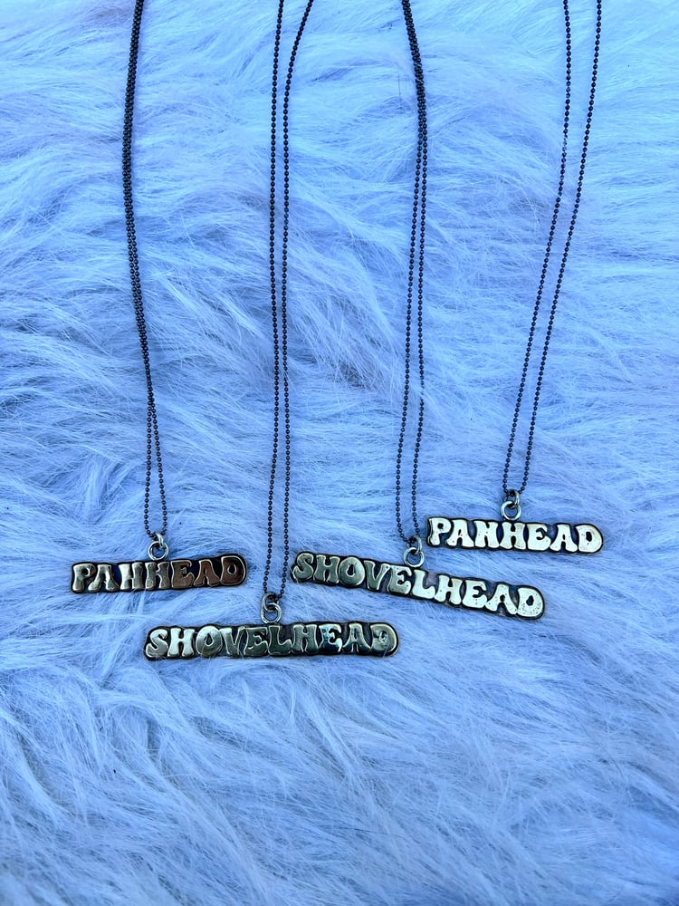 Hand-sawn brass Shovelhead or Panhead pendant, crafted in groovy 70's-inspired lettering and polished to perfection. Each pendant comes on an 18" sterling silver bead chain.