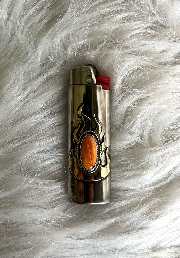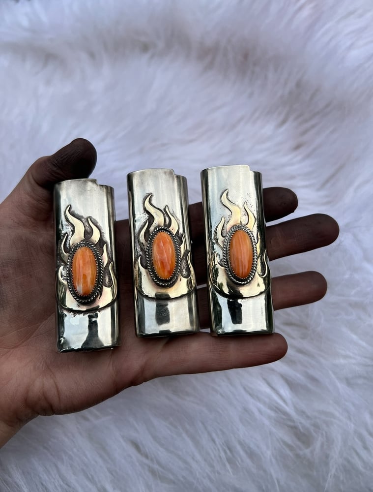 Flick yo’ bick! 🔥 Hand-sawn brass flames embellished with fiery spiny oyster in a .925 sterling silver setting.