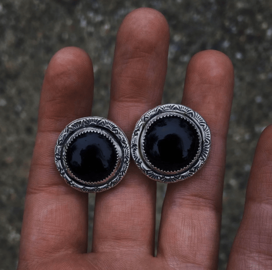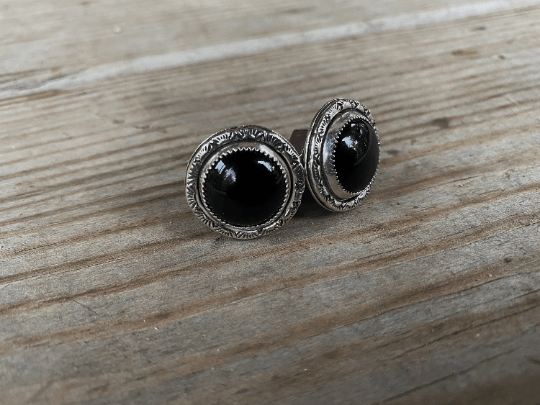 Handmade to stand out, these Black Onyx Bolts are set in a sterling silver serrated bezel and nestled within a hand-stamped sunburst border that adds a bold, clean look to your ride. The perfect blend of craftsmanship and style for your build.