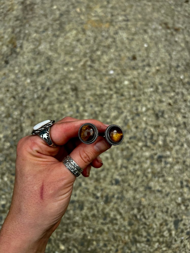 Bring a bold look to your ride with these Tiger’s Eye License Bolts. Featuring rich, golden-brown Tiger’s Eye stones, each set in a hand-fabricated .925 sterling serrated setting with a sterling rope border.