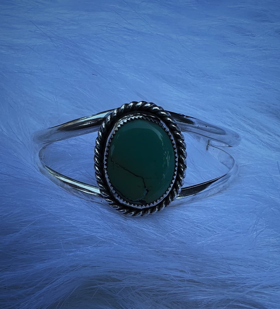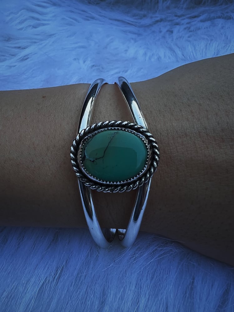 This one's a head-turner. The comfortable split cuff features gorgeous Treasure Mountain turquoise in a serrated bezel and sterling rope detail setting.