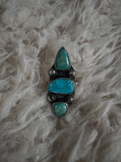 Hand-crafted in .925 sterling silver, this show-stopping ring features three gorgeous pieces of turquoise, silver embellishments, and a super comfortable hand-stamped band.