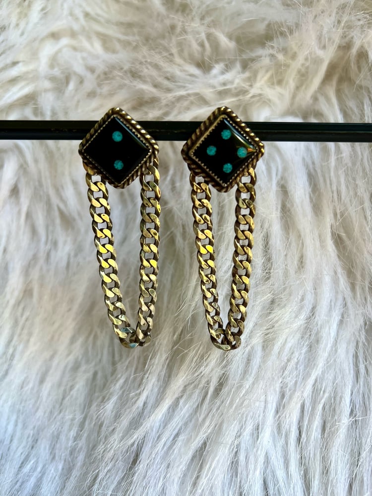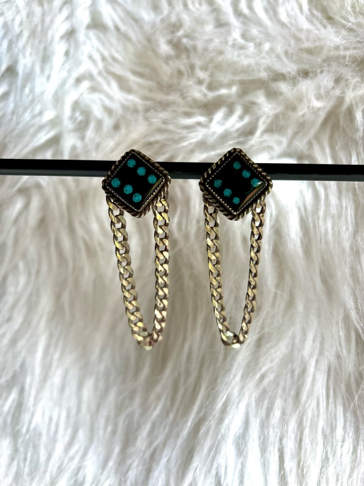 This collection of the Tumbling Dice Earrings feature natural jet inlaid with turquoise. Set in sterling rope suspended above 6mm sterling curb chain, these earrings hang just under 3" and have comfortable post backings.