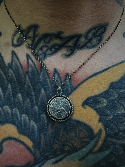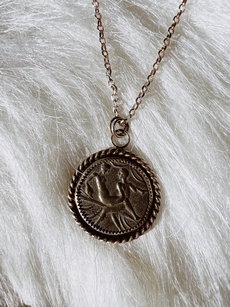 Each coin is unique featuring a different act and varying slightly in shape and size based on the cast from the original spintria. The back of the coins are numbered and the sterling silver setting has been cut to show the unique roman numeral on the back of the coin. The settings are hand-fabricated in .925 sterling silver and feature a serrated bezel and sterling cord.