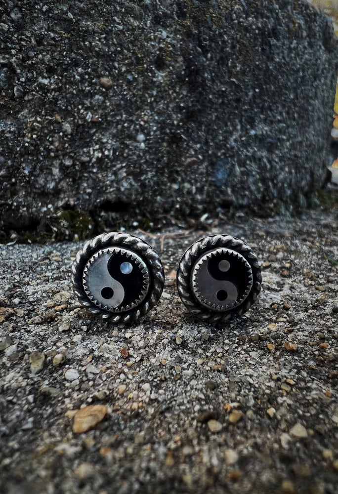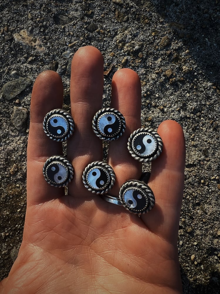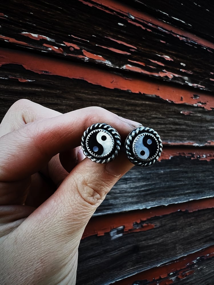 Embrace the duality of your ride with these Yin Yang bolts. Crafted using an intarsia inlay technique with natural shell and horn, these unique pieces sit in a hand-fabricated .925 sterling silver serrated bezel with a sterling rope border.